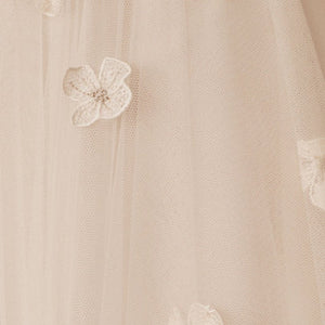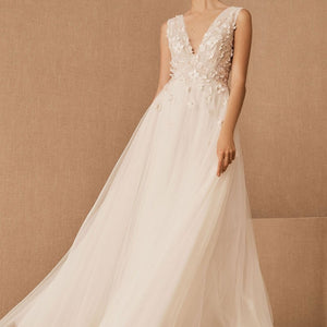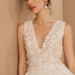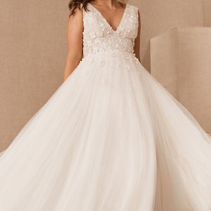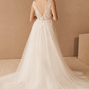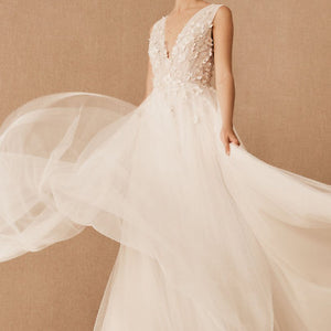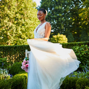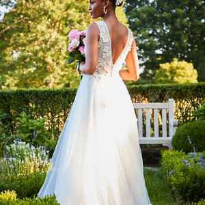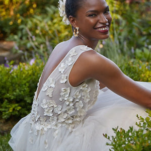 Dimensional floral appliques flutter atop this gown’s V-neck bodice, which has a plunging back with dainty covered buttons. An airy tulle skirt with a flowy train completes this romantic look. By Jenny Yoo.