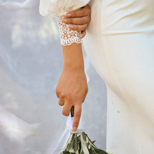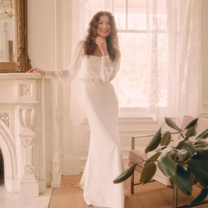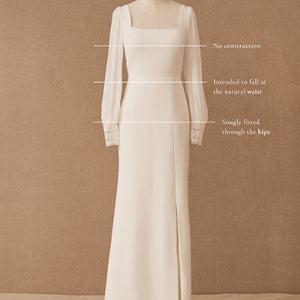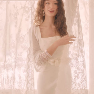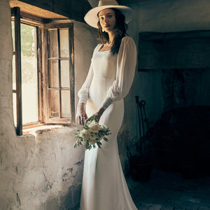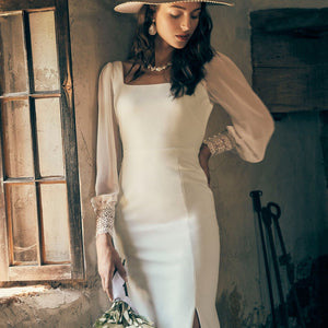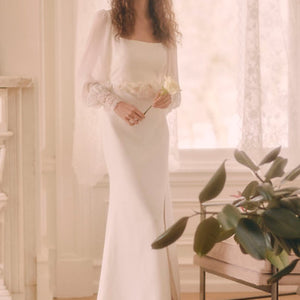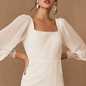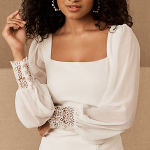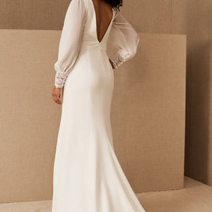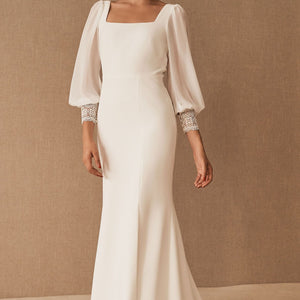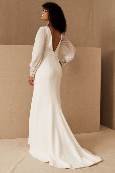 A square neckline and plunging open back lend a modern edge to this fitted crepe gown, while sheer puff sleeves gather into lace cuffs for a romantic finishing flourish.