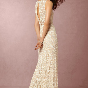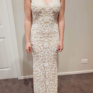 Hand-beaded and complete with a low-v back, this stunning gown is the epitome of both craftsmanship and luxury.