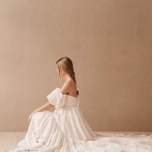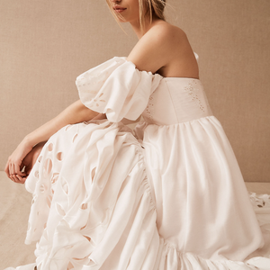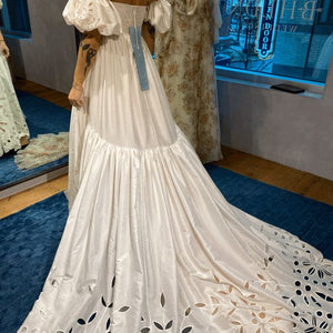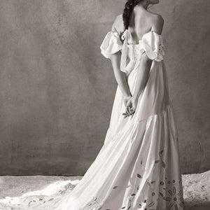 Created entirely by hand, this bohemian gown's large-scale cutwork takes its cues from French Regency design. We hunted high and low for a cotton silk taffeta with the perfect slub texture, which allows the gown's dramatic silhouette to strike a balance between nostalgia and modernity. Off-the-shoulder puff sleeves and a sweeping train complete this maximalist look.