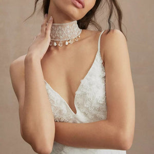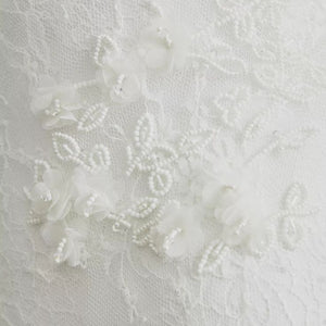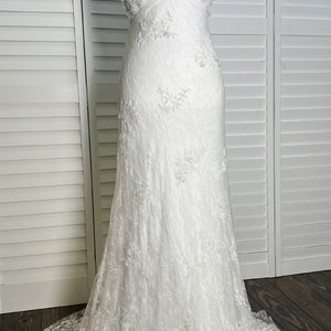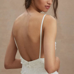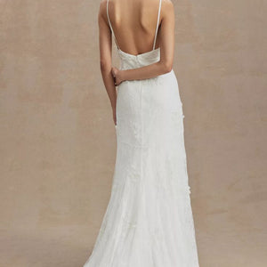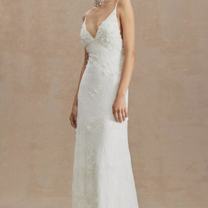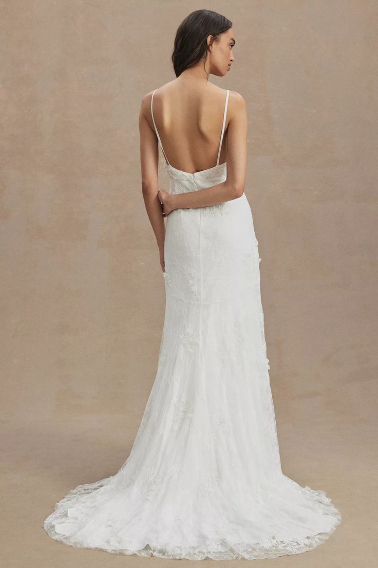 The BHLDN Meadow Wedding Gown is a maxi-length sheath silhouette boasting an elegant v-neckline, open back, and chapel-length train. This vintage-inspired style is adorned with fluttering floral appliqué embellishments for a romantic finishing touch.