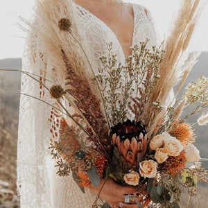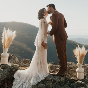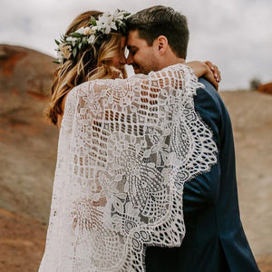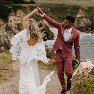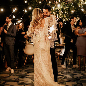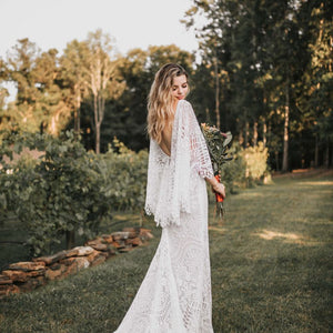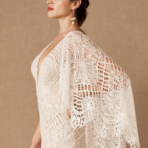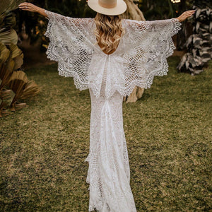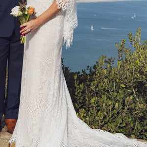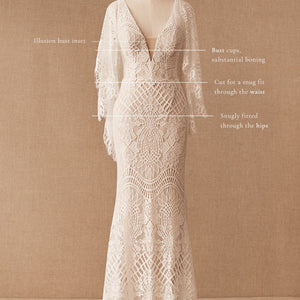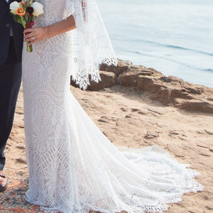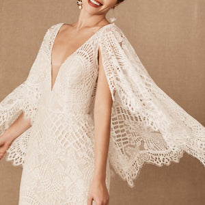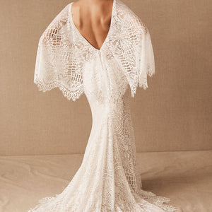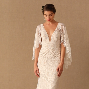 Made from intricate graphic lace, this fitted gown features a plunging v-neckline and dramatic train. The cascading flutter sleeves transform into a gorgeous cape detail to frame the open back.  By BHLDN Whispers & Echoes.