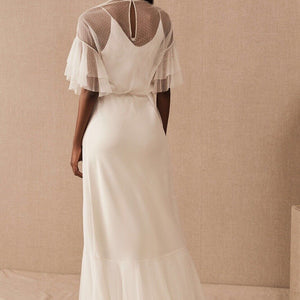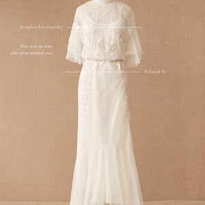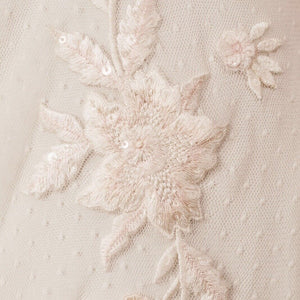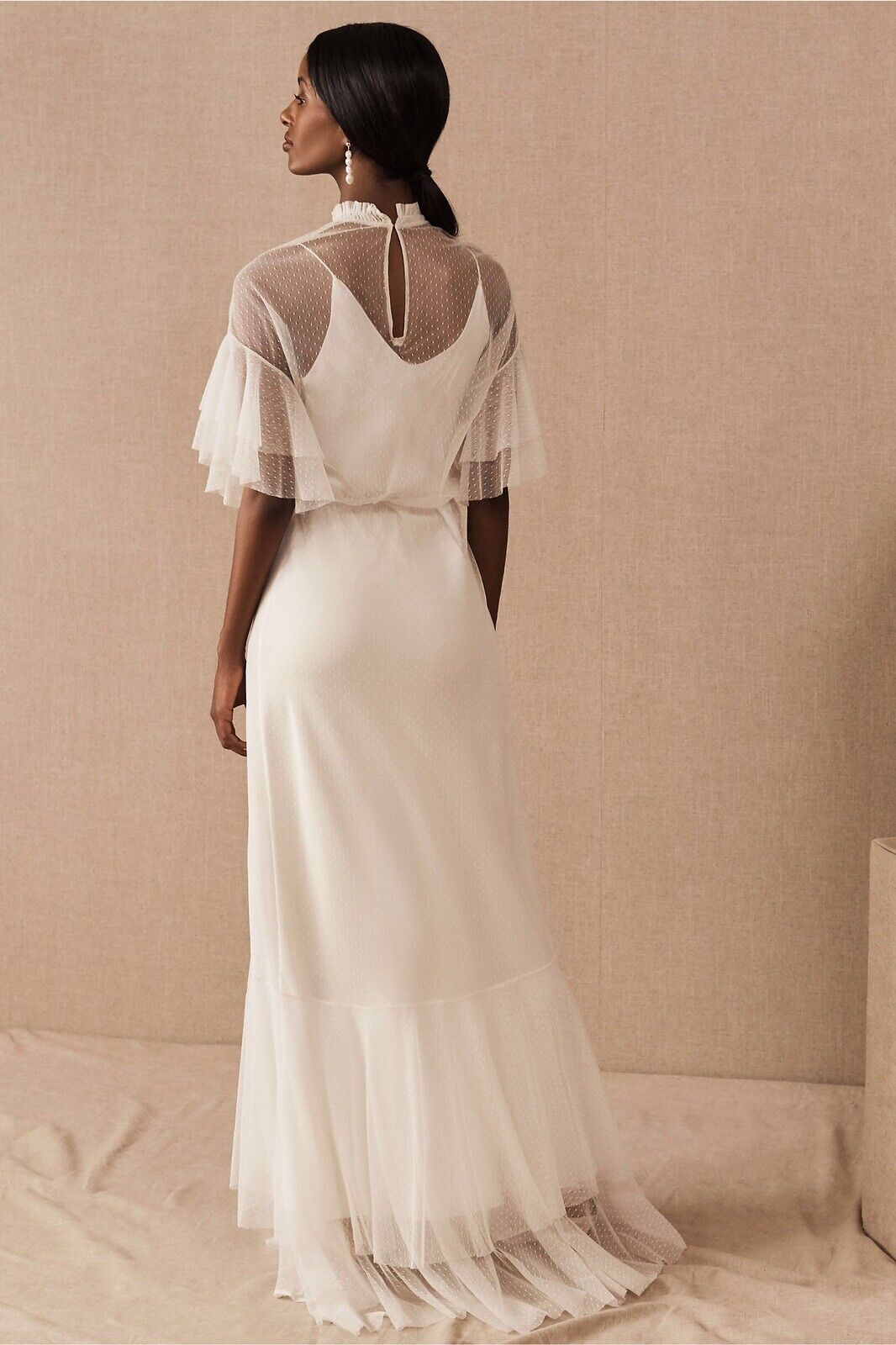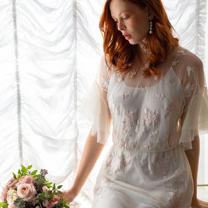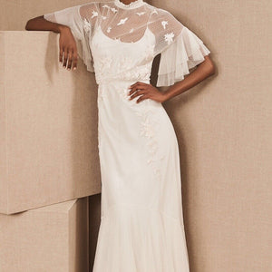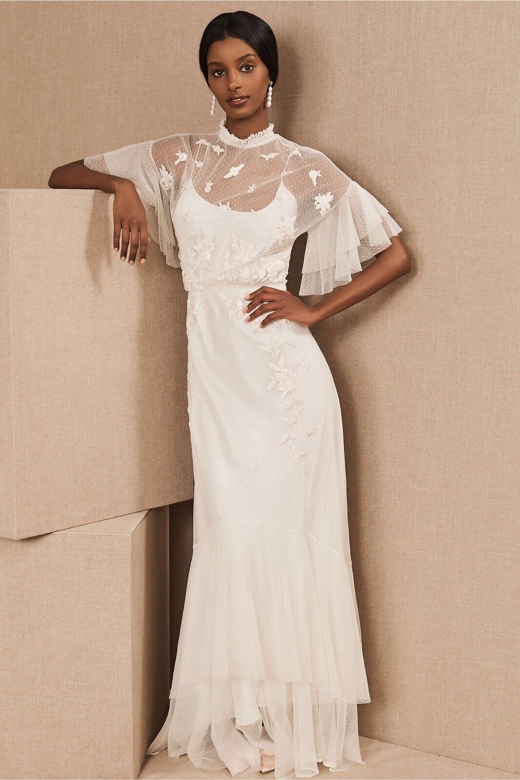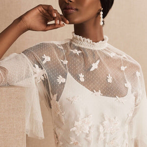 A sheer, ruffled high neck flows into layers of Swiss dot tulle on this charmingly bohemian fit-and-flare gown. Pastel embroidery whispers across the bodice and skirt for a vintage-inspired effect with fluttery sleeves adding extra movement.
