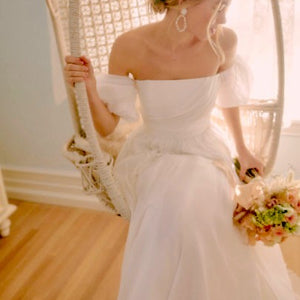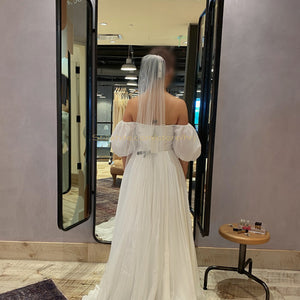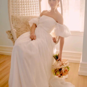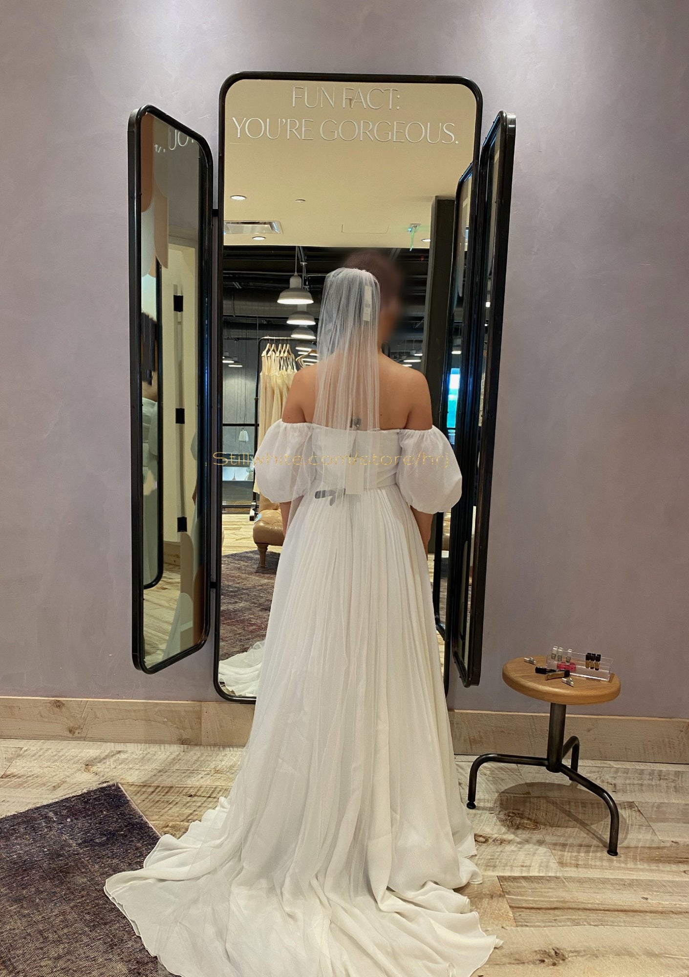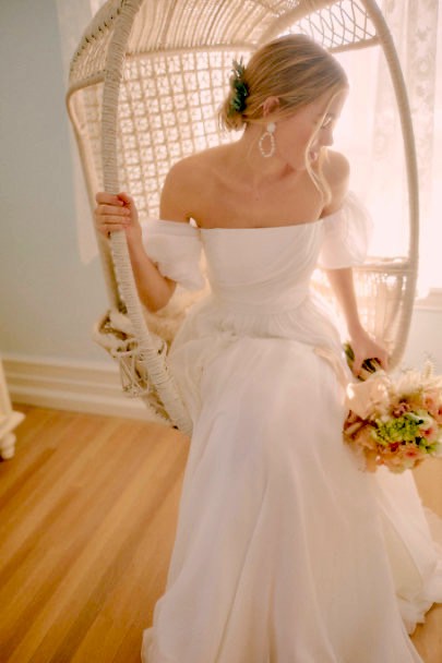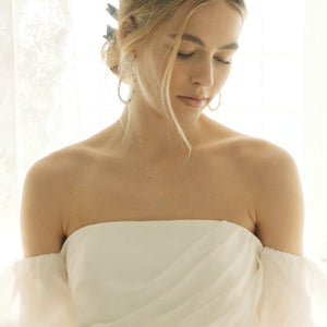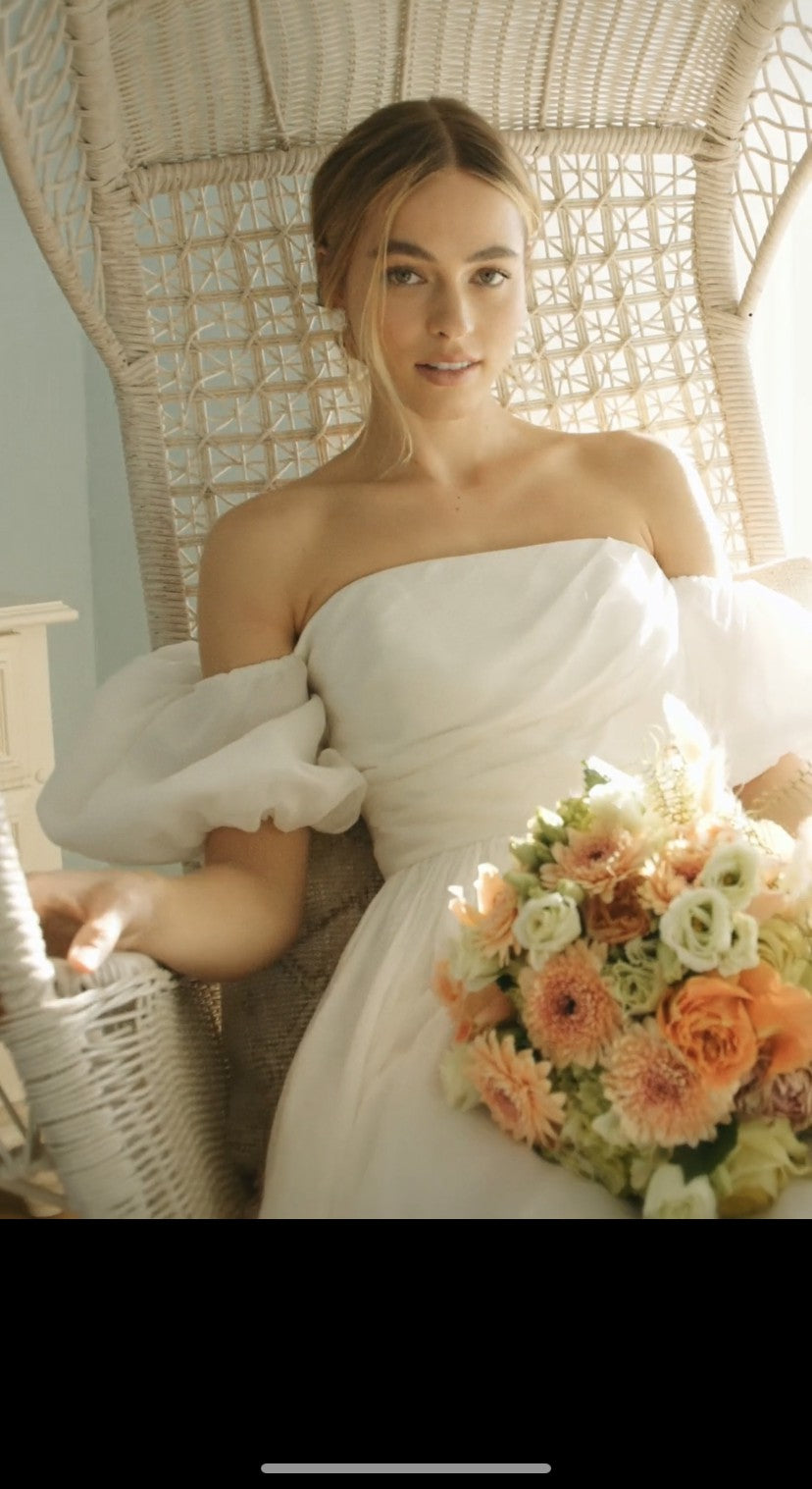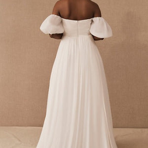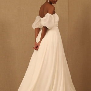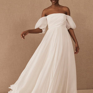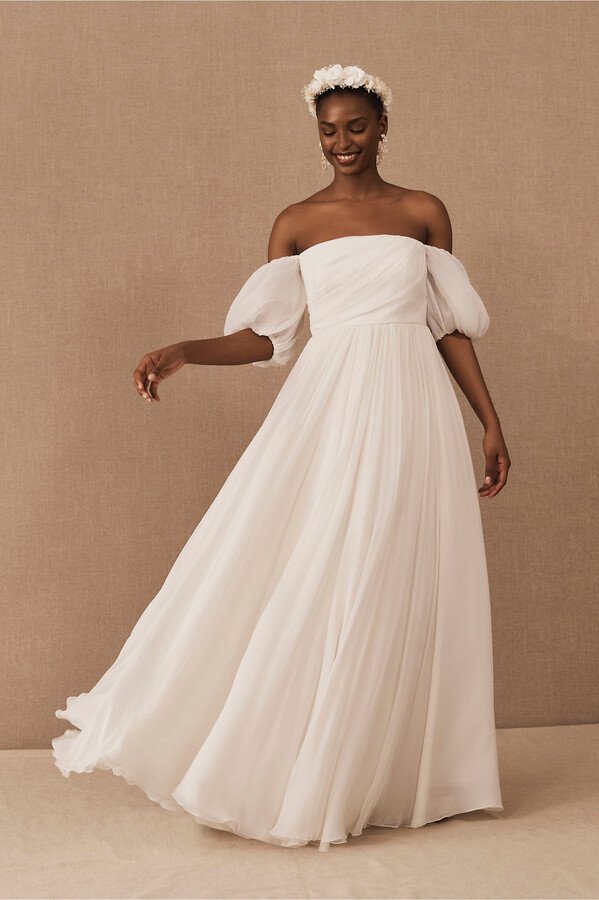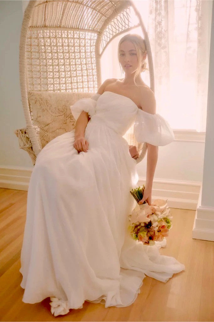 Made from airy chiffon for effortless movement, this flowy gown is finished with voluminous off-the-shoulder puff sleeves. Sachin & Babi Darcy is a modern chiffon A-line gown featuring puffed off the shoulder sleeves! The straight neckline + simple silhouette create a minimalistic + elegant look!