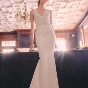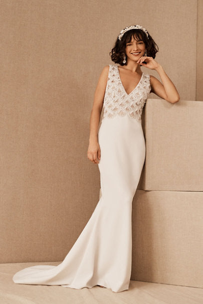Gatsby-inspired beading brings brilliant sparkle to this gown’s intricately embellished bodice, while an elegantly tailored satin skirt creates a flawless silhouette. By Sachin & Babi.