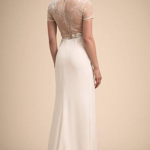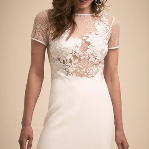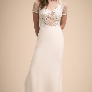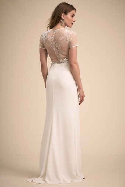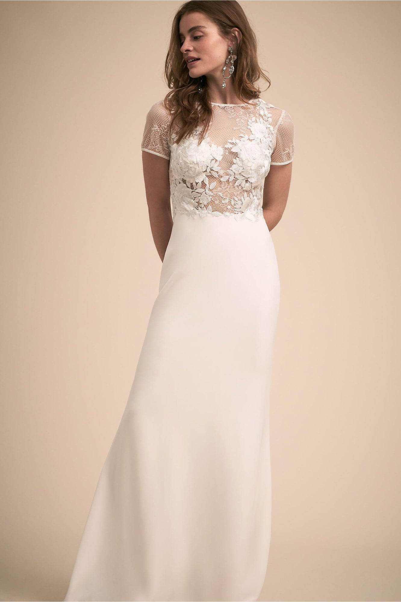A sheer bodice with artfully placed laced tops a crisp white skirt for a gown that's equal parts modern and romantic. By Tadashi Shoji.