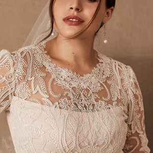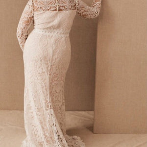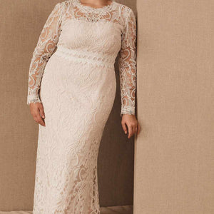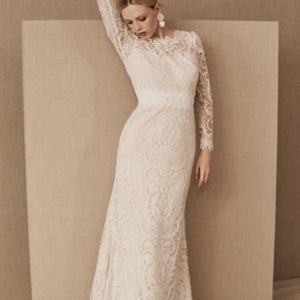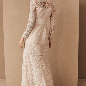 This long-sleeve column gown is made from intricately embroidered stretch tulle with a knit lining for added comfort and an antique-inspired lace waistband. Ribbon embroidery adds texture at the high neckline, while sheer sleeves provide an airy finishing touch.
