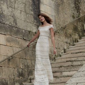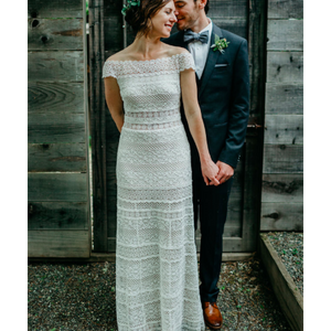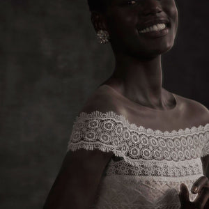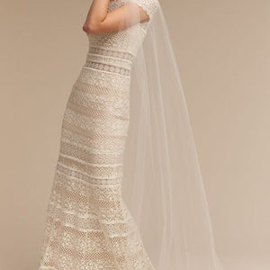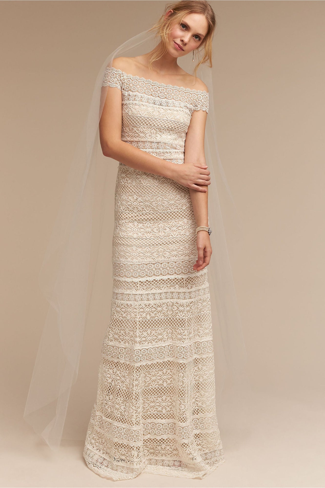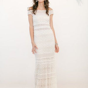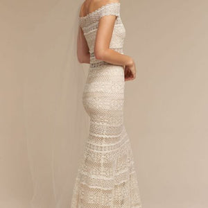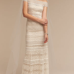 Sleek and form-fitting, this gown features a stunning mix of textured and graphic patterns. Semi-sheer cutouts trim the neckline and waist, and scalloped edges add playfulness. Illusion tulle lends extra support, keeping the off-the-shoulder sleeves perfectly in place.