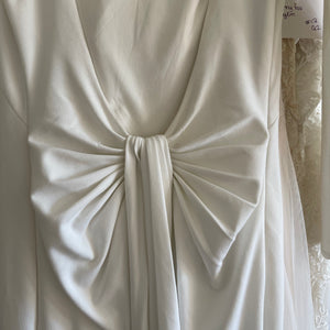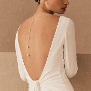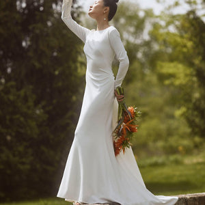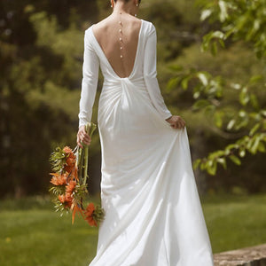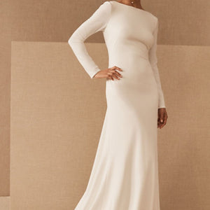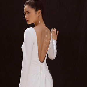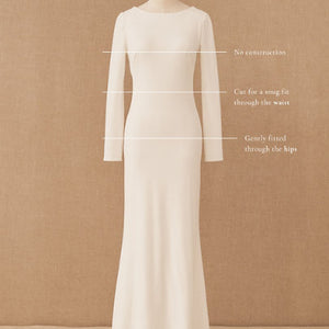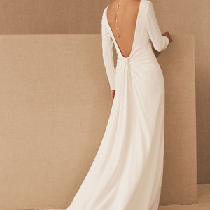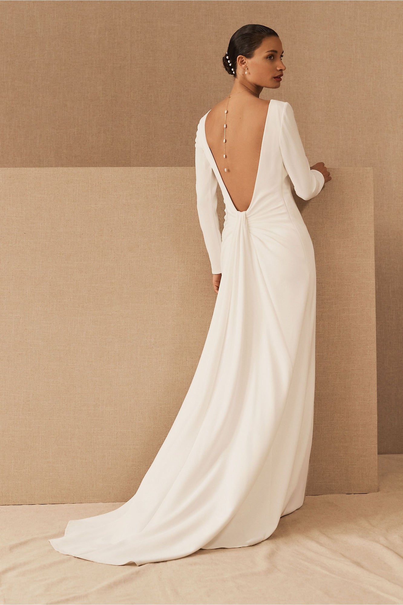 This clean crepe gown is perfect for the minimalist bride, featuring long sleeves and a flawlessly fitted silhouette. A daring open back and draped train combine to make a sleek statement. By Tadashi Shoji.