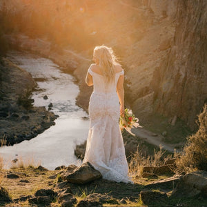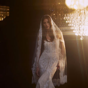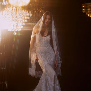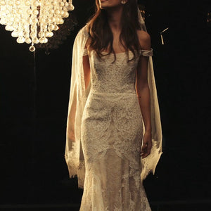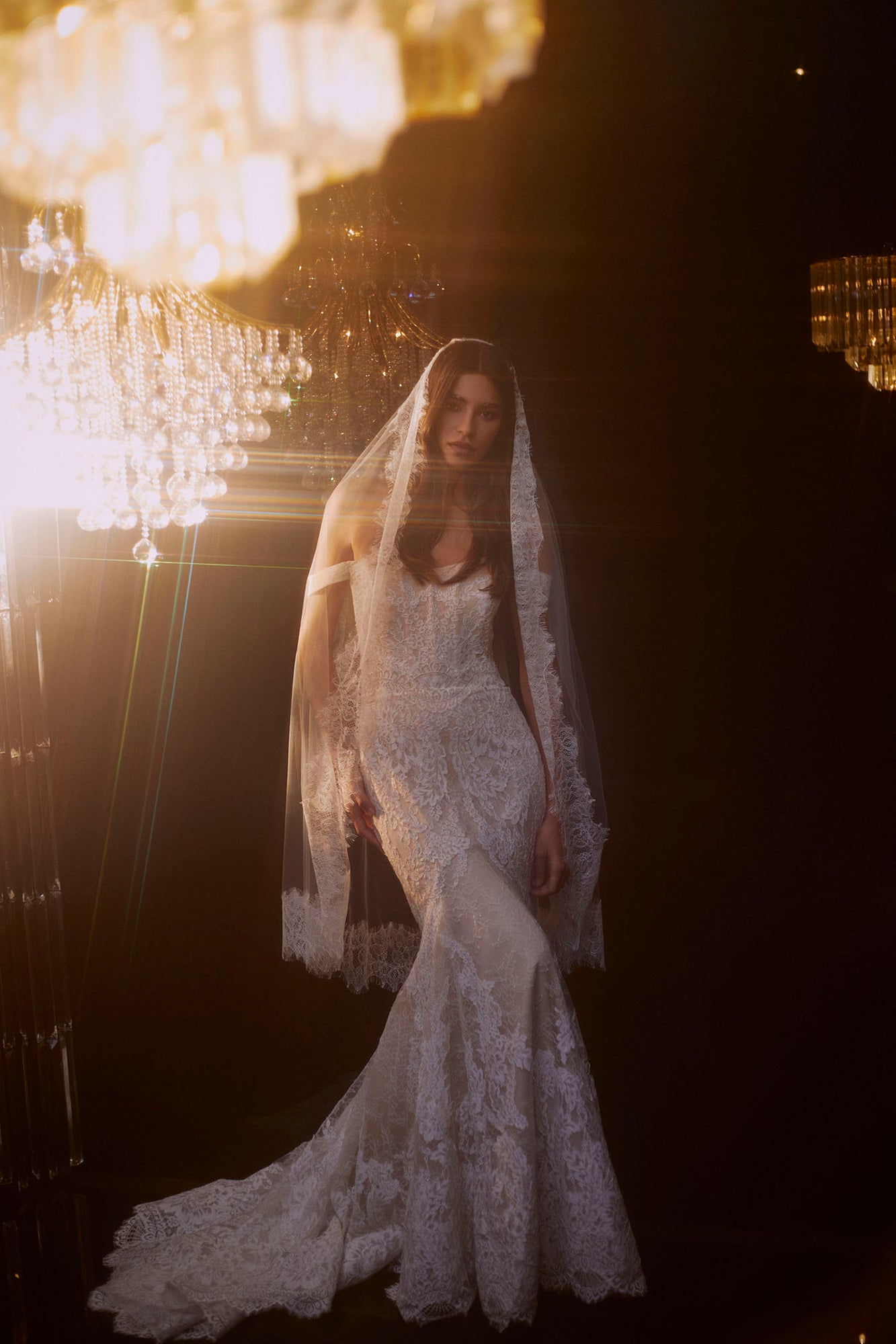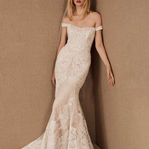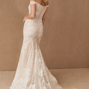 A mix of Thicket and Brier laces atop a blush lining brings extraordinary dimension to this strapless gown with a fitted silhouette. An off-the-shoulder neckline and corset bodice complete the look. By Watters.