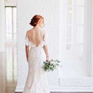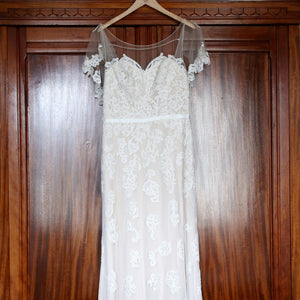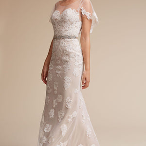 A garden's worth of 3D ivory blooms cascades the length of this exquisite gown, lined in a beautiful champagne hue. Floral trim decorates the flutter sleeves and back while a figure-flattering bodice enhances curves. The dress dress has an illusion neckline with beautiful and unique sheer flutter sleeves with lace detailing. By Willowby by Watters.