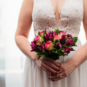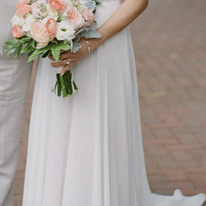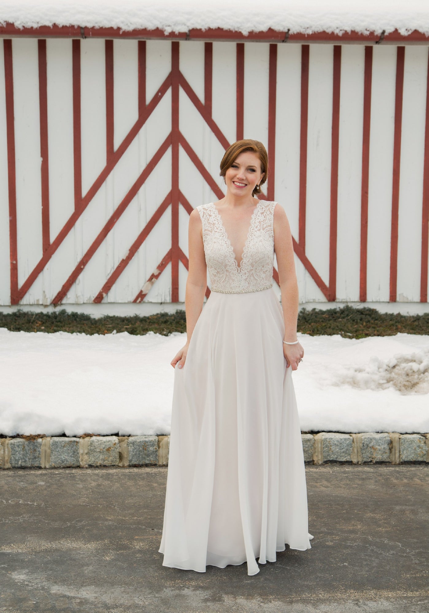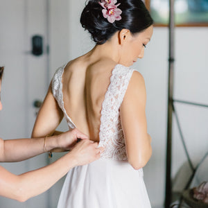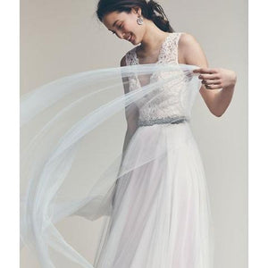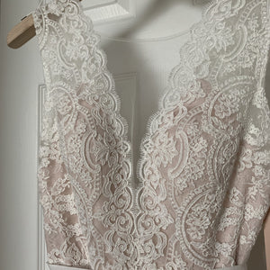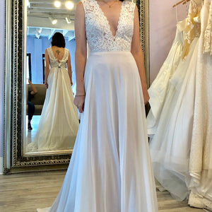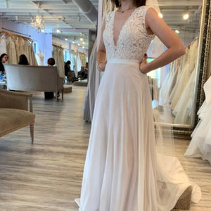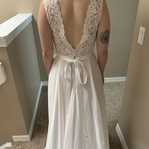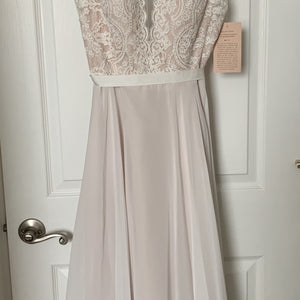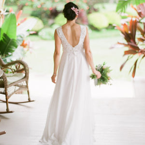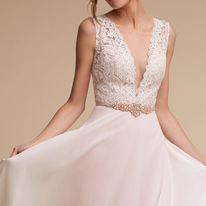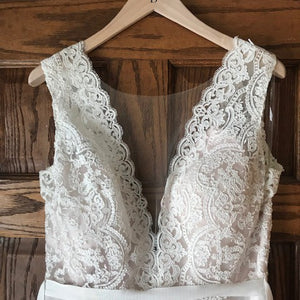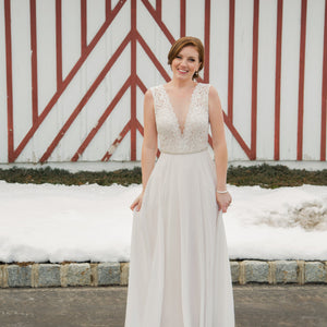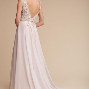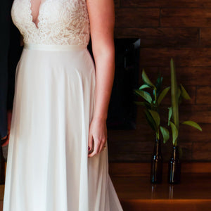 Delicate lace traverses the bodice of this romantic gown, framing a dramatic v-neck and back. Blush lining peeks out from beneath for an illusory effect while a soft ivory chiffon skirt brings cloud-like movement.