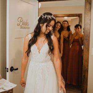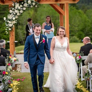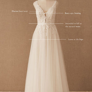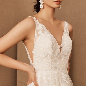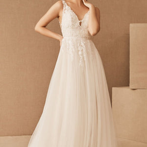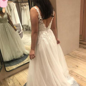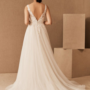 Romantic botanical embroidery flows across this gown’s fitted V-neck bodice and into the frothy tulle skirt. A graceful open back and softly sweeping train complete the look. By Wtoo by Watters.