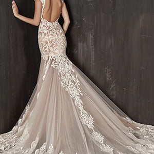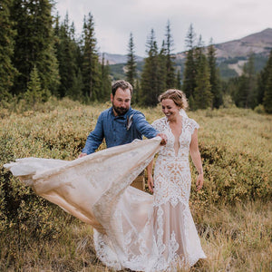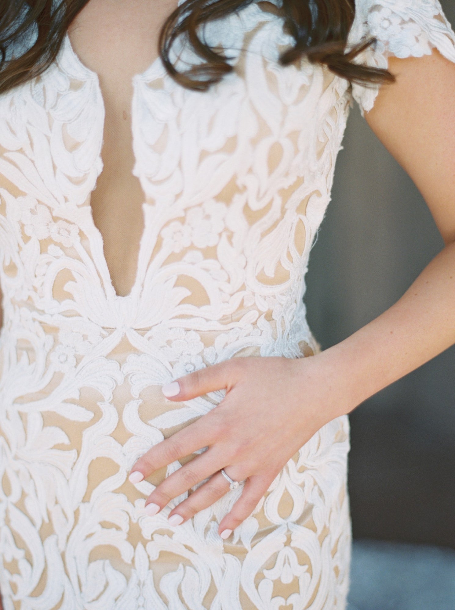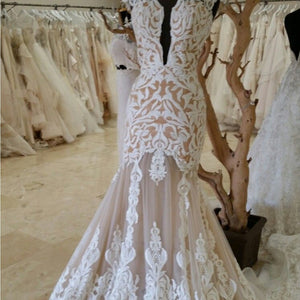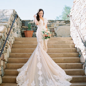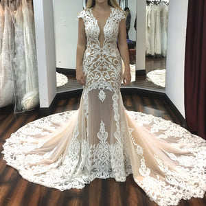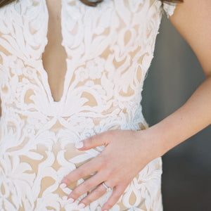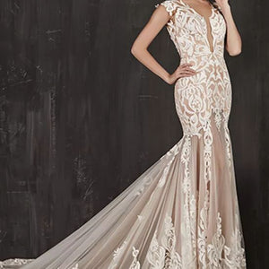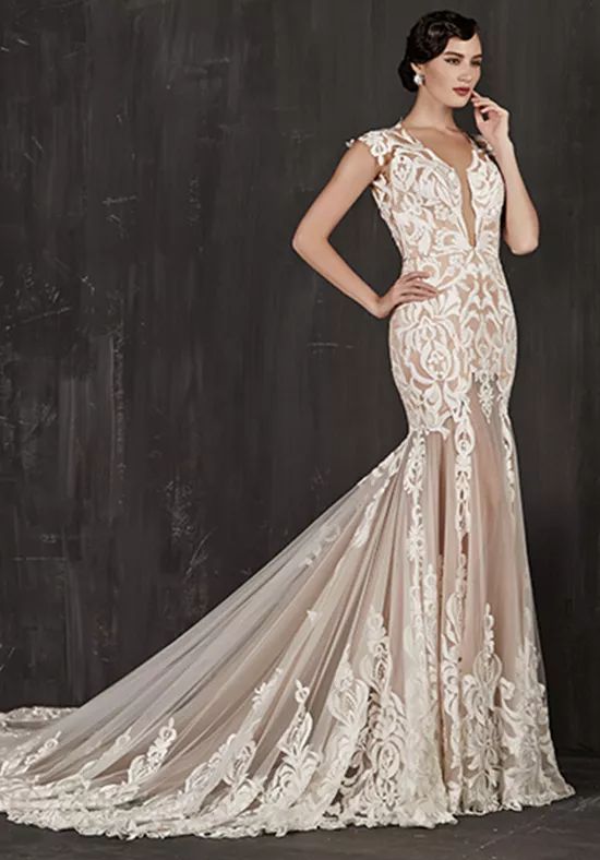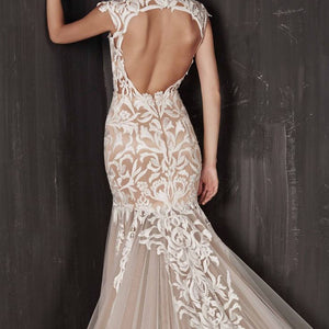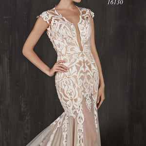 The elegantly placed embroidered lace over tulle accentuates the sheath silhouette with cap sleeves and an open back. It is available in Ivory/Nude.