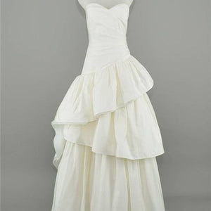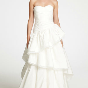 Our design team went above and beyond in creating this dreamy, statement-making gown. Layer upon layer of exquisite fabrics—from cotton-silk faille to organza and tulle—form the soft, magnificently layered tiers. The icing on the cake? A crisscross bodice and a just-short-of-sweetheart neckline that we fell for at first sight.