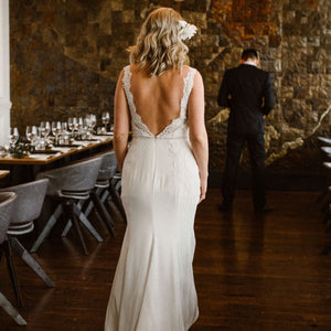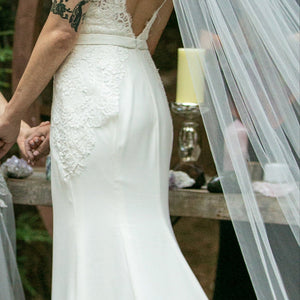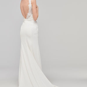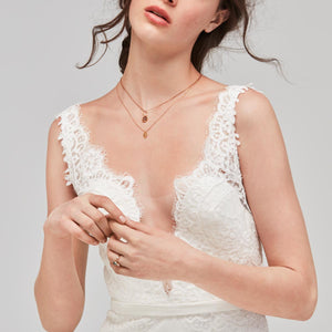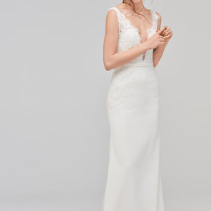 For more traditional tastes, Lief lined is the perfect blend of shape and styling. Sarana lace flows over illusion tulle and Georgette in a classic silhouette. Color: Ivory.
