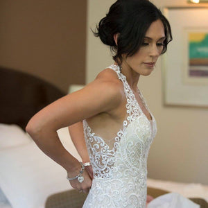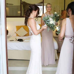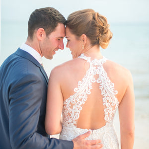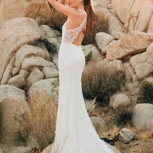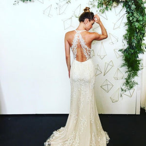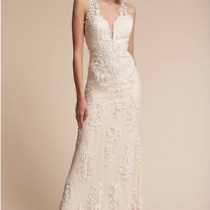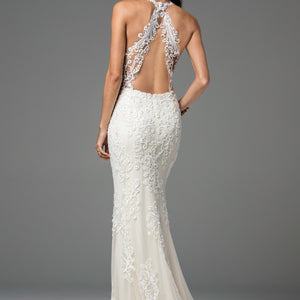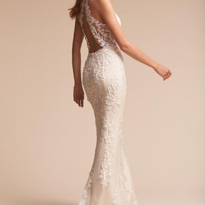 Exquisitely crafted with all-over Diya Lace, Sookie is perfect for the bohemian-chic bride. A slim fit-and-flare silhouette highlights this striking backless gown, while Diya Lace straps featuring Illusion Tulle meet at the nape of the neck for an unexpected twist.