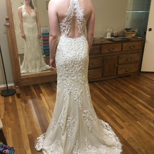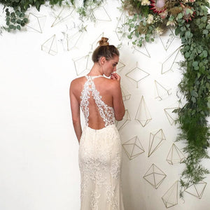 This backless gown is equal parts bohemian and chic. We love the plunging sweetheart neckline and slim silhouette, but the crossed back guipure lace straps are what set this design apart. A slight train finishes the look. Color: Ivory.