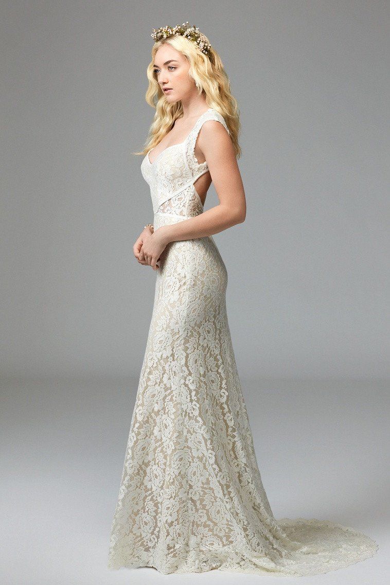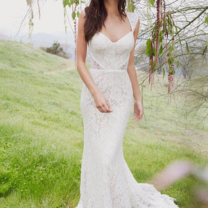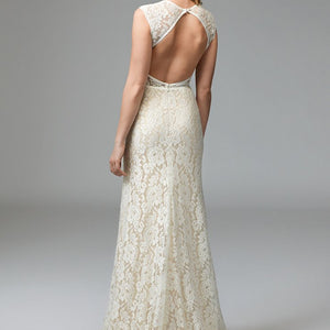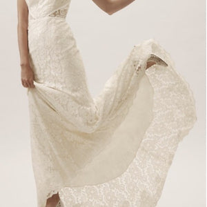 For the modern boho bride, look no further than our Twilla gown. Made of Zuzu Stretch Lace, this style is the perfect blend of soft and structured. Twilla features a Queen Anne neckline and keyhole back, and is trimmed with Grosgrain Ribbon detailing. Puddle Train.