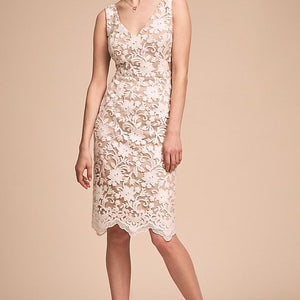 Subtly sequined floral embroidery bedecks a chic nude sheath with a v-neckline and scalloped hem. Back Zip. Color: Ivory / Nude.