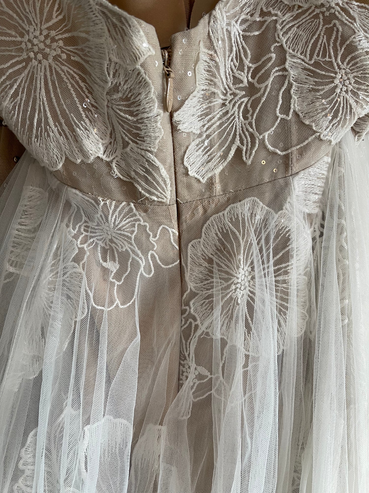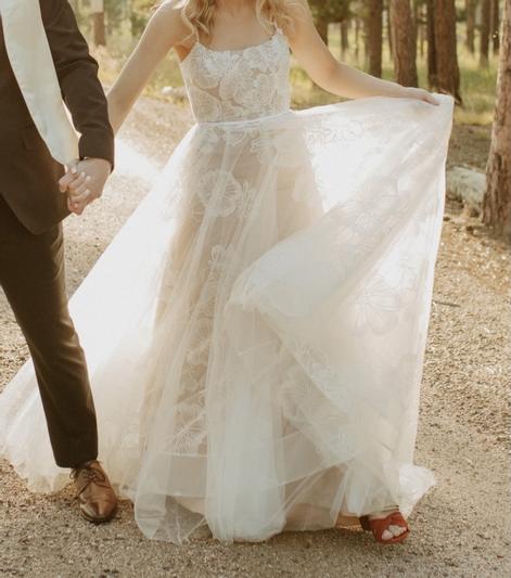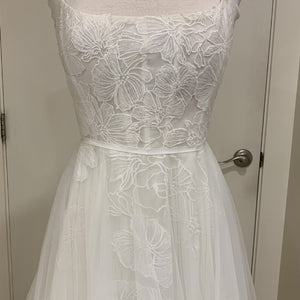 Size 14.  Has been tried on in store and has a few loose/missing beads on the straps.  There is minor dust along the hemline and the tulle near the zipper has become detached in a few small areas (see last picture).  Overall in very good condition!  Retail price: $1,695.