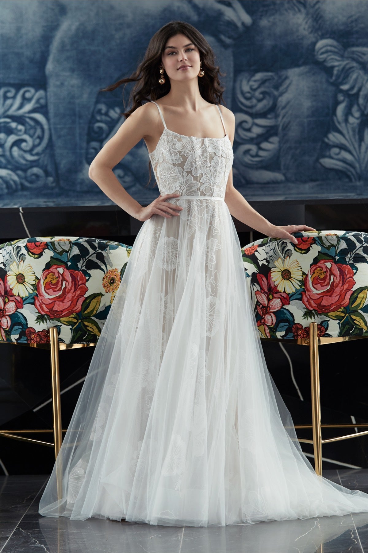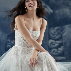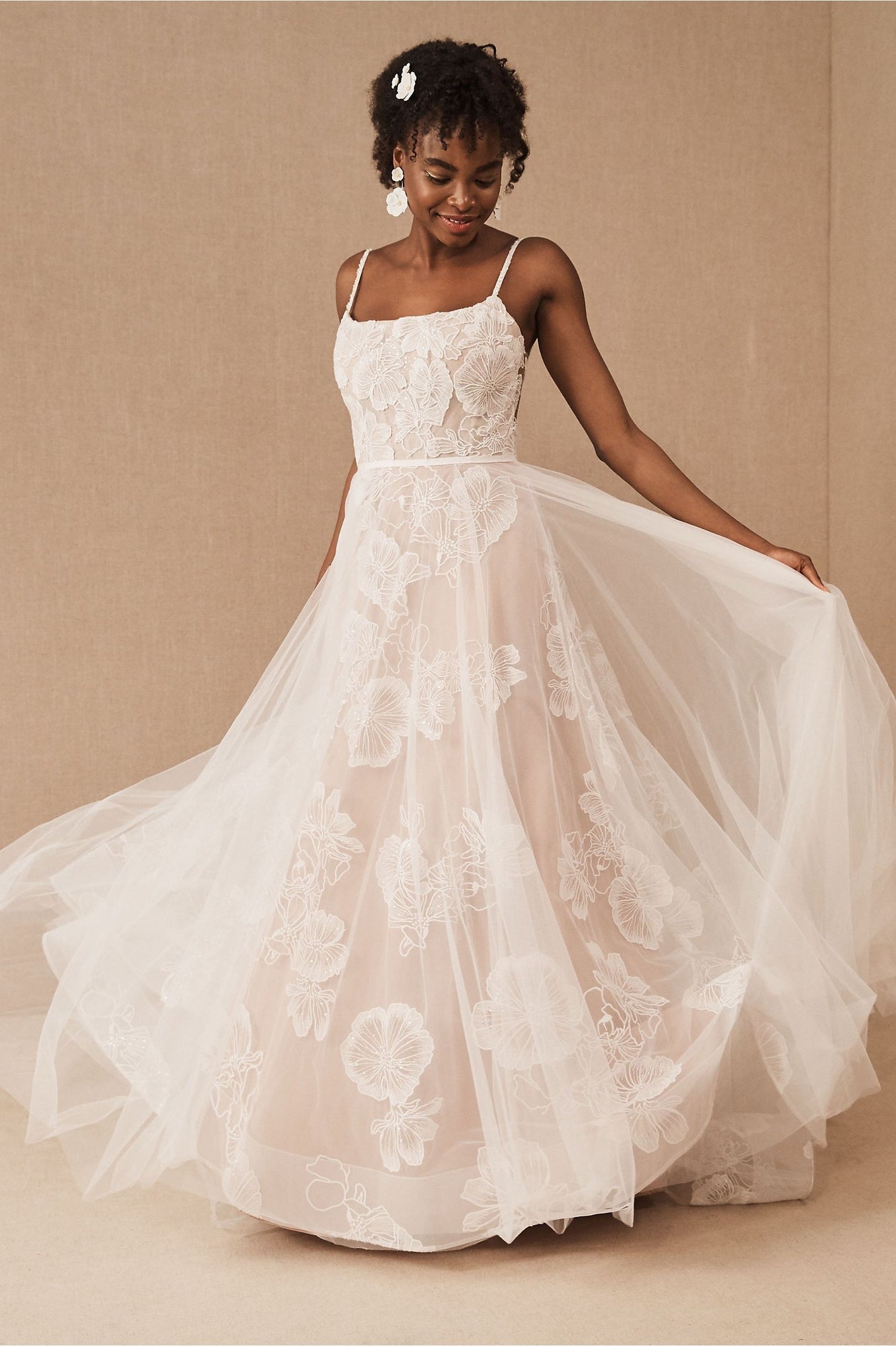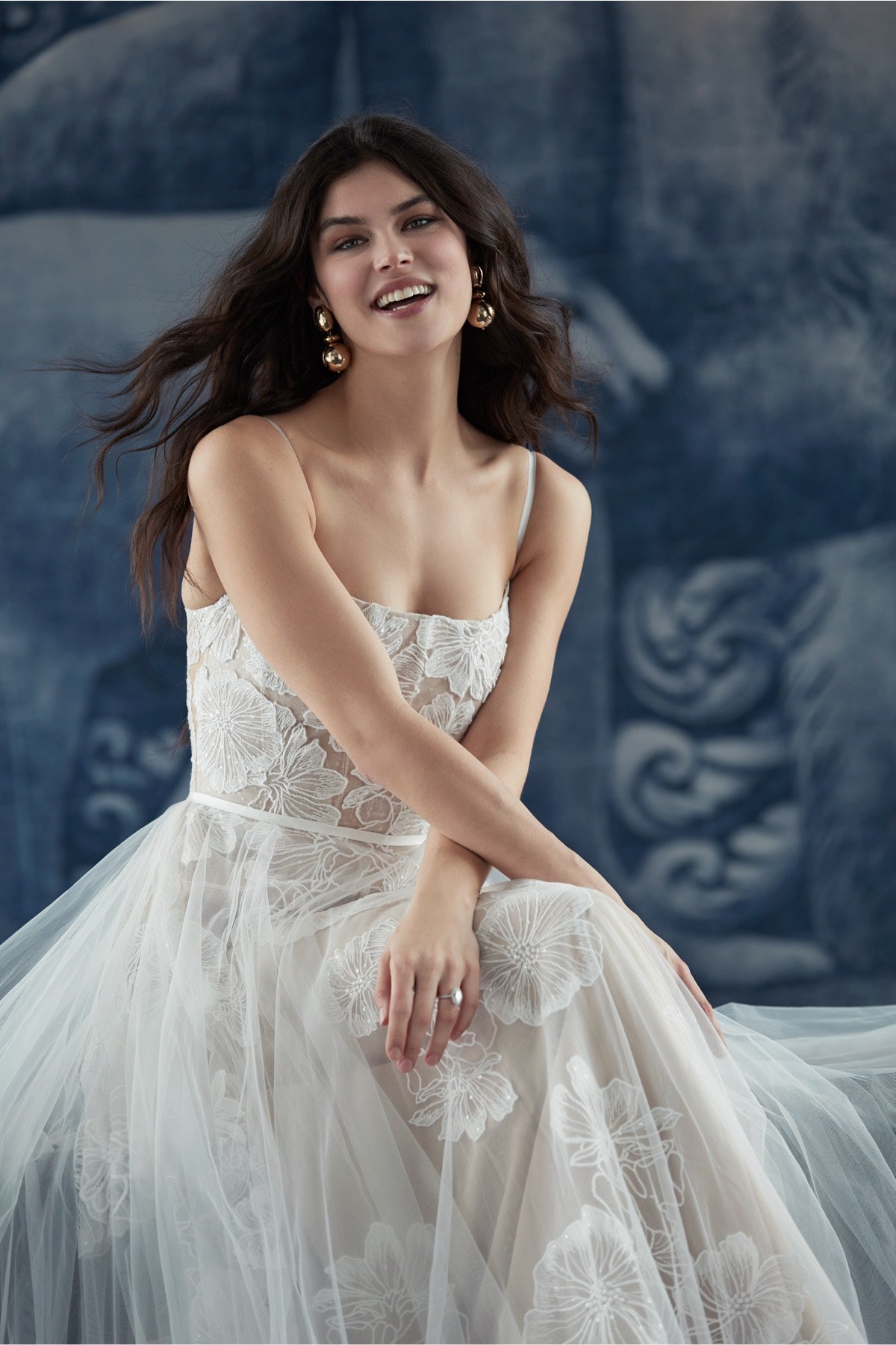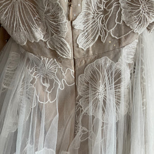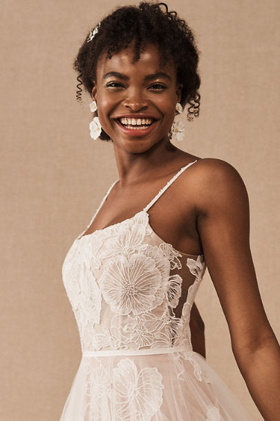 Made from delicate tulle, this dreamy gown is replete with romantic touches. Our favorites? Oversized floral embroidery, an airy overskirt, and a scattering of clear sequins for subtle sparkle. By Wtoo by Watters.