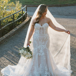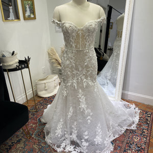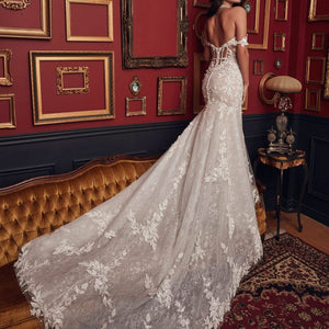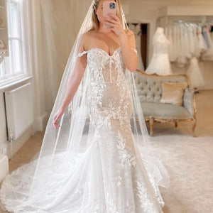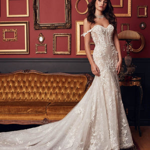 Romance meets sex appeal in this sheath wedding gown. Designed with a romantic sweetheart neckline accentuated by frilly, detachable off-the-shoulder straps, a structured bodice, and 3D lace appliqués, she’s perfect for a bride who wants to feel both glamorous and flirtatious!