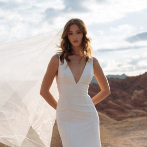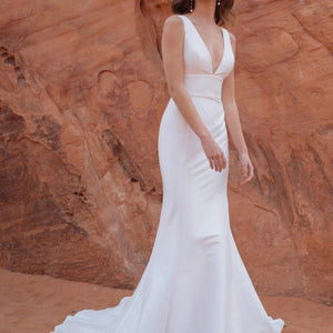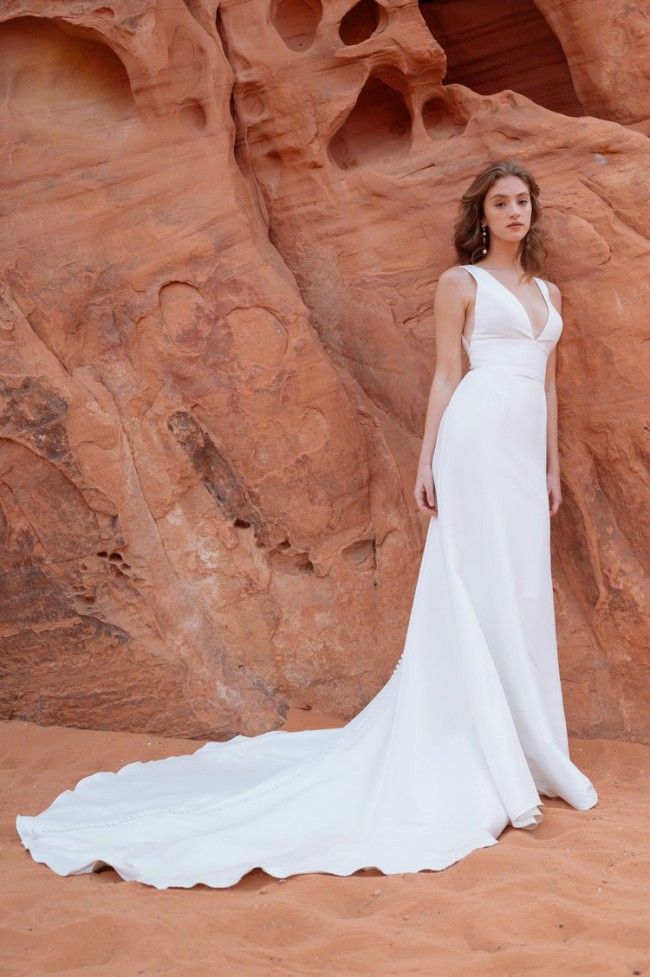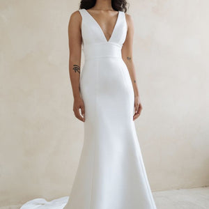 The Ilana gown is the epitome of sleek and chic. Cut in our lustrous soft stretch faille, the fabric gives off a slight sheen that elevates the gown for a more formal feel. The plunging neckline is anchored by a flattering cummerbund waist. The gown does not have a slit.