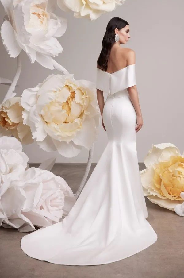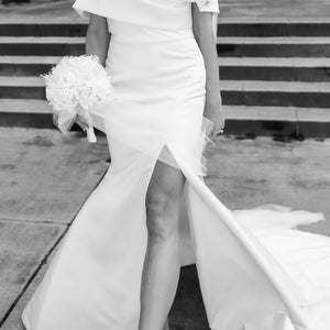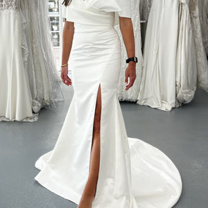 Mesmerizing elegant fitted gown. Featuring a sleek satin skirt with a leg slit and a graceful off-shoulder draped collared bodice with a sweetheart neckline that accentuates your natural beauty.