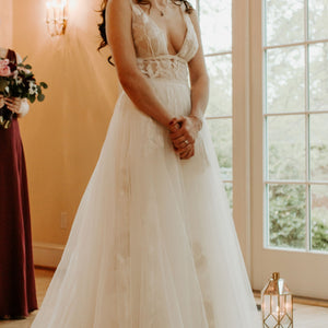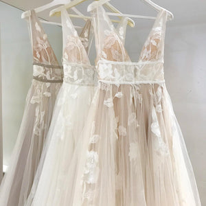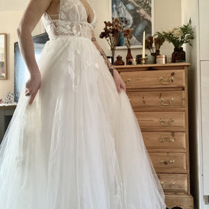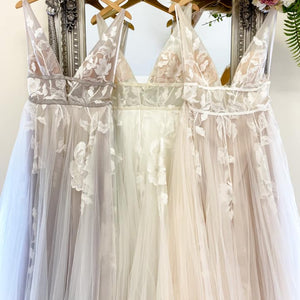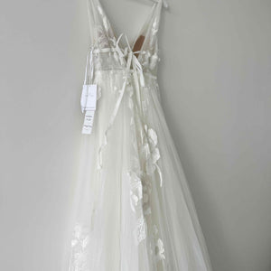 This gown is so romantic and whimsical, what else could you want for your wedding gown? This gown is covered in tulle back floral appliqués that start at the bodice and trickle down the skirt. Each floral has a little sparkle for that hint of shimmer. The waist is accentuated with two rows of velvet ribbon. Color: Ivory.