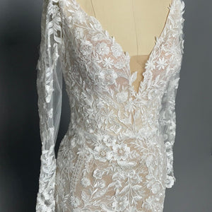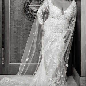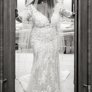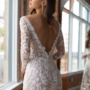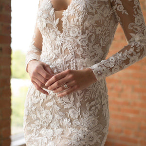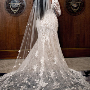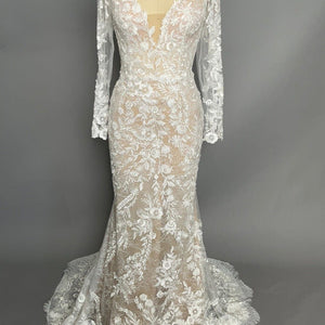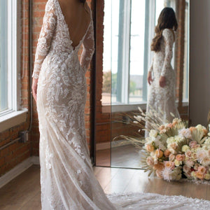 Delicate yet bold, the Lucia gown is adorned with ranging sizes of the Zori Motif scattered in sequins. This dress is sure to turn heads with its intricate design and curve-hugging silhouette. This dress is the long sleeve version.