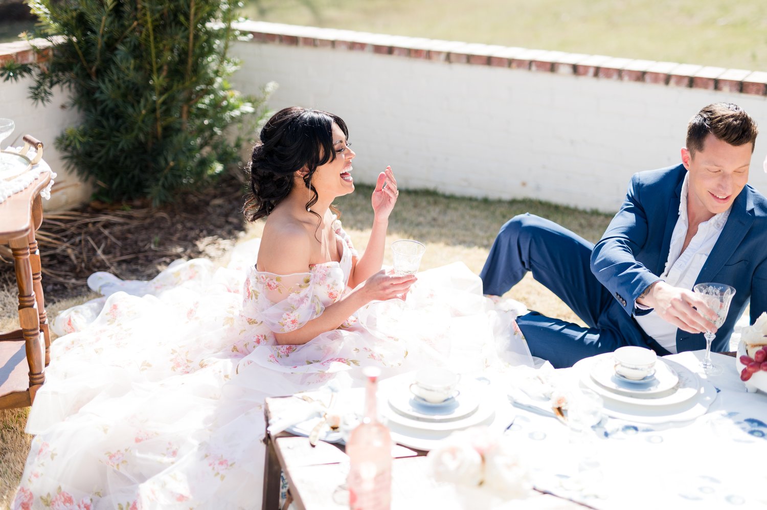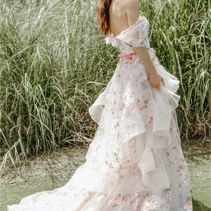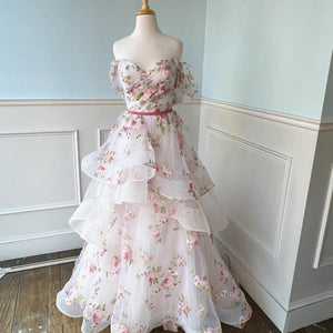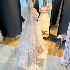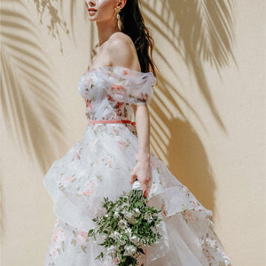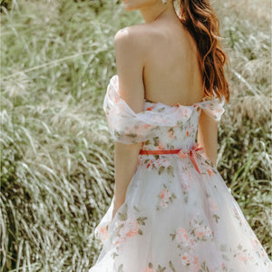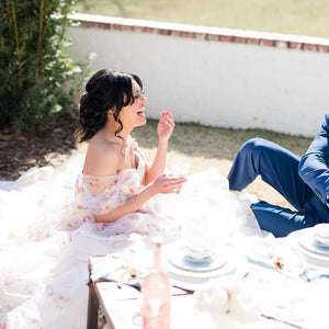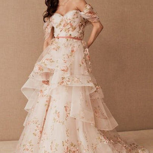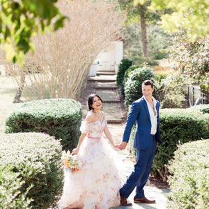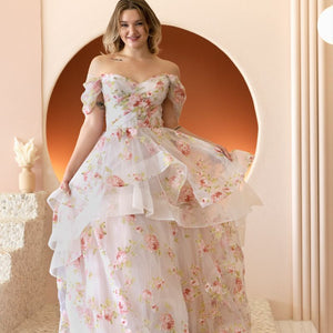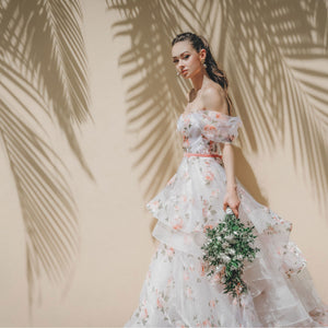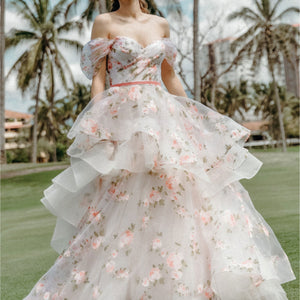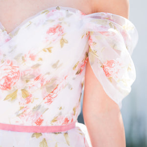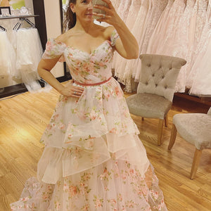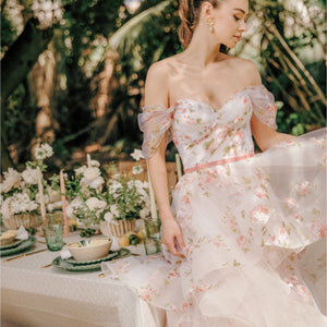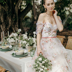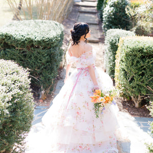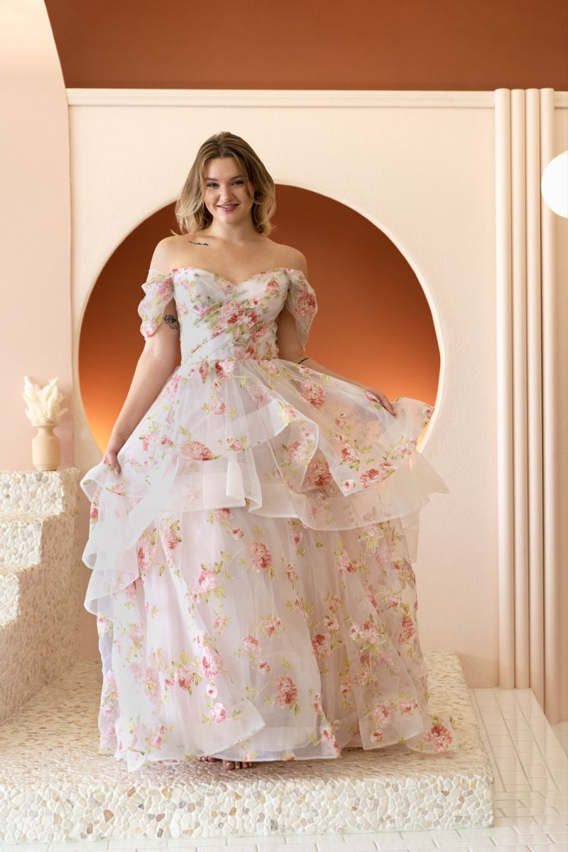 The new Eden Floral printed organza drapes the bodice in a soft moscato pink shade while the tiered skirt sends florals cascading to the floor. The support from the boning within the bodice allows for a subtle off-the-shoulder look, which tends to highlight the decolletage beautifully when combined with a sweetheart neckline.